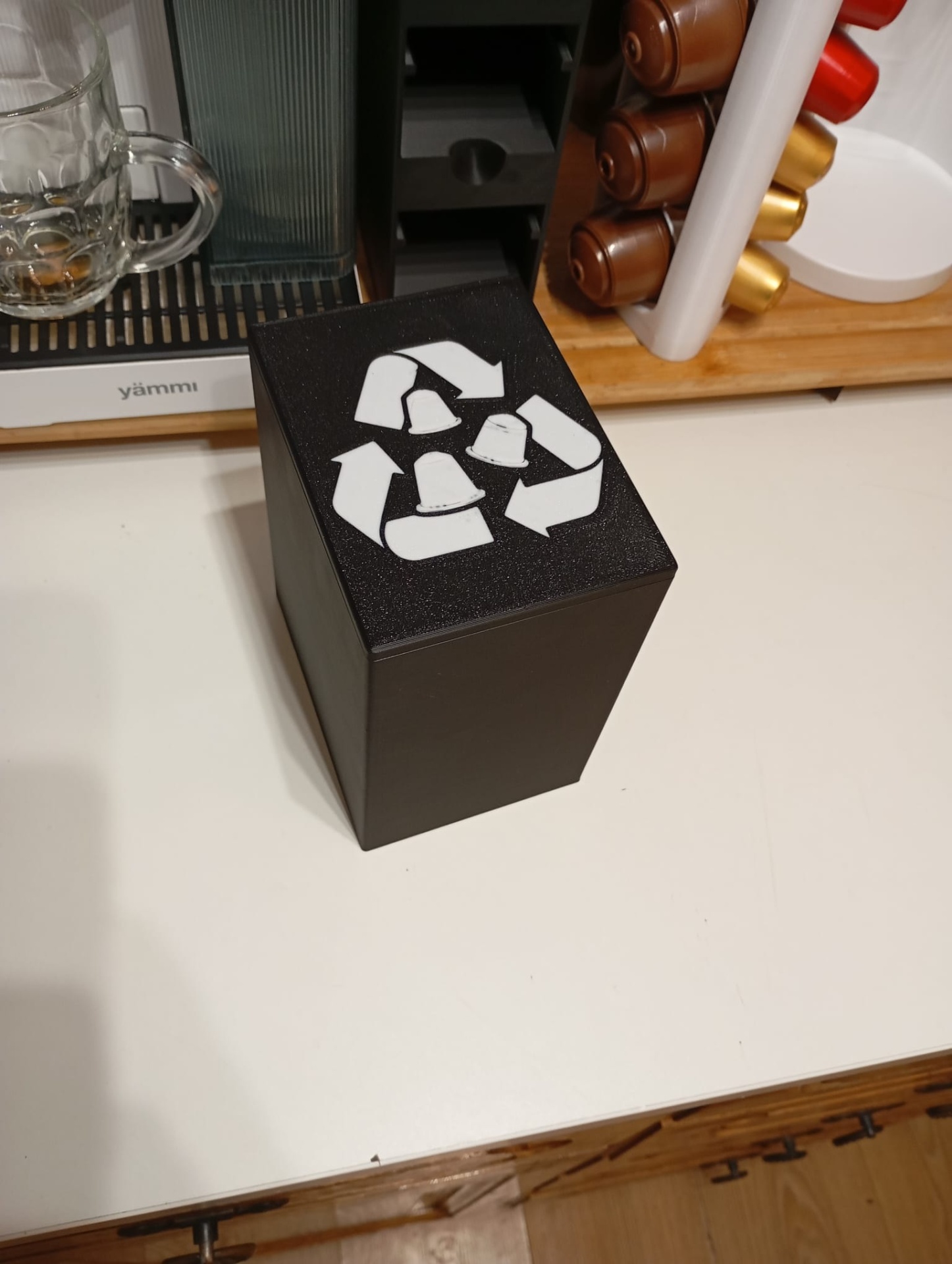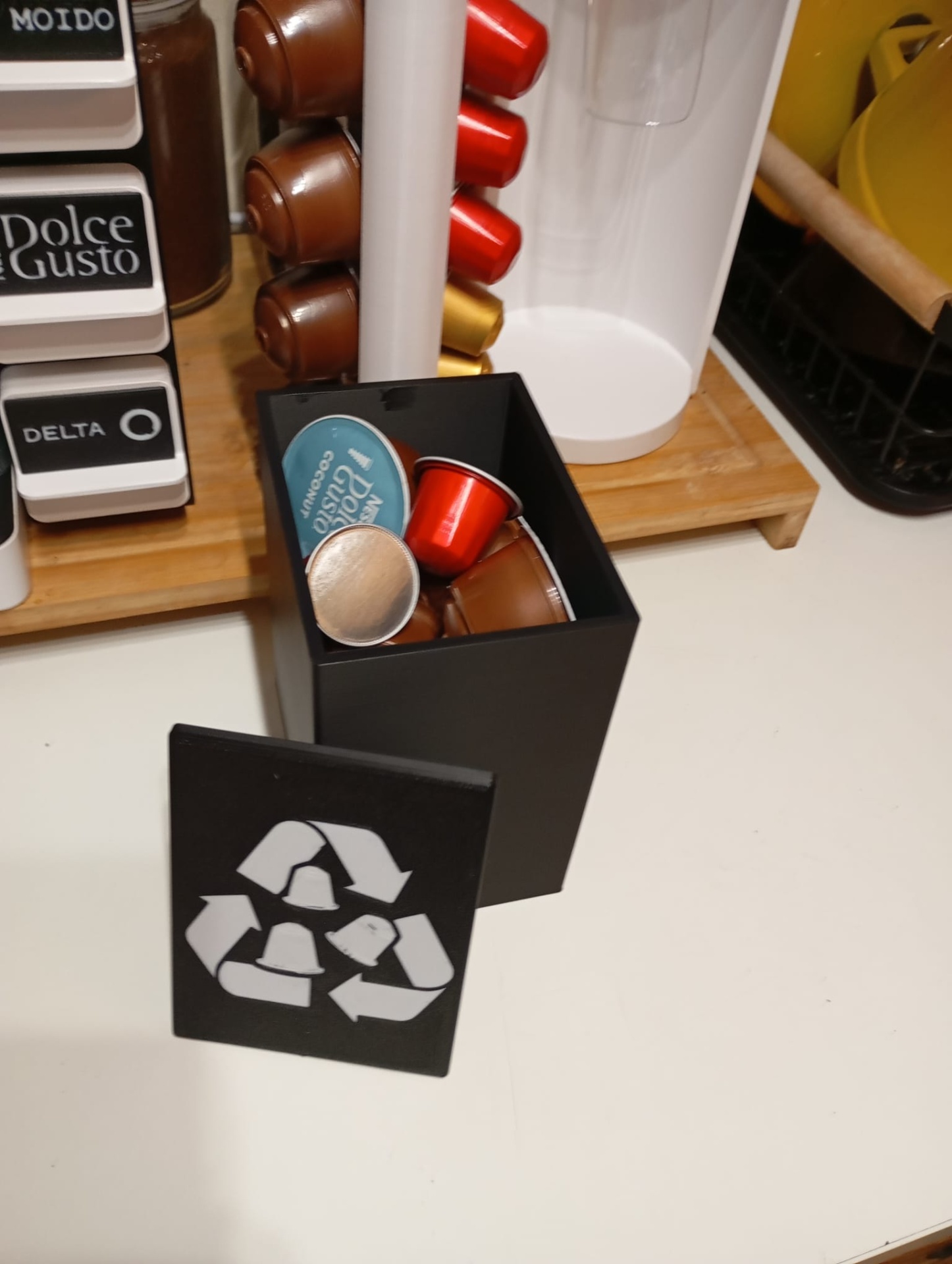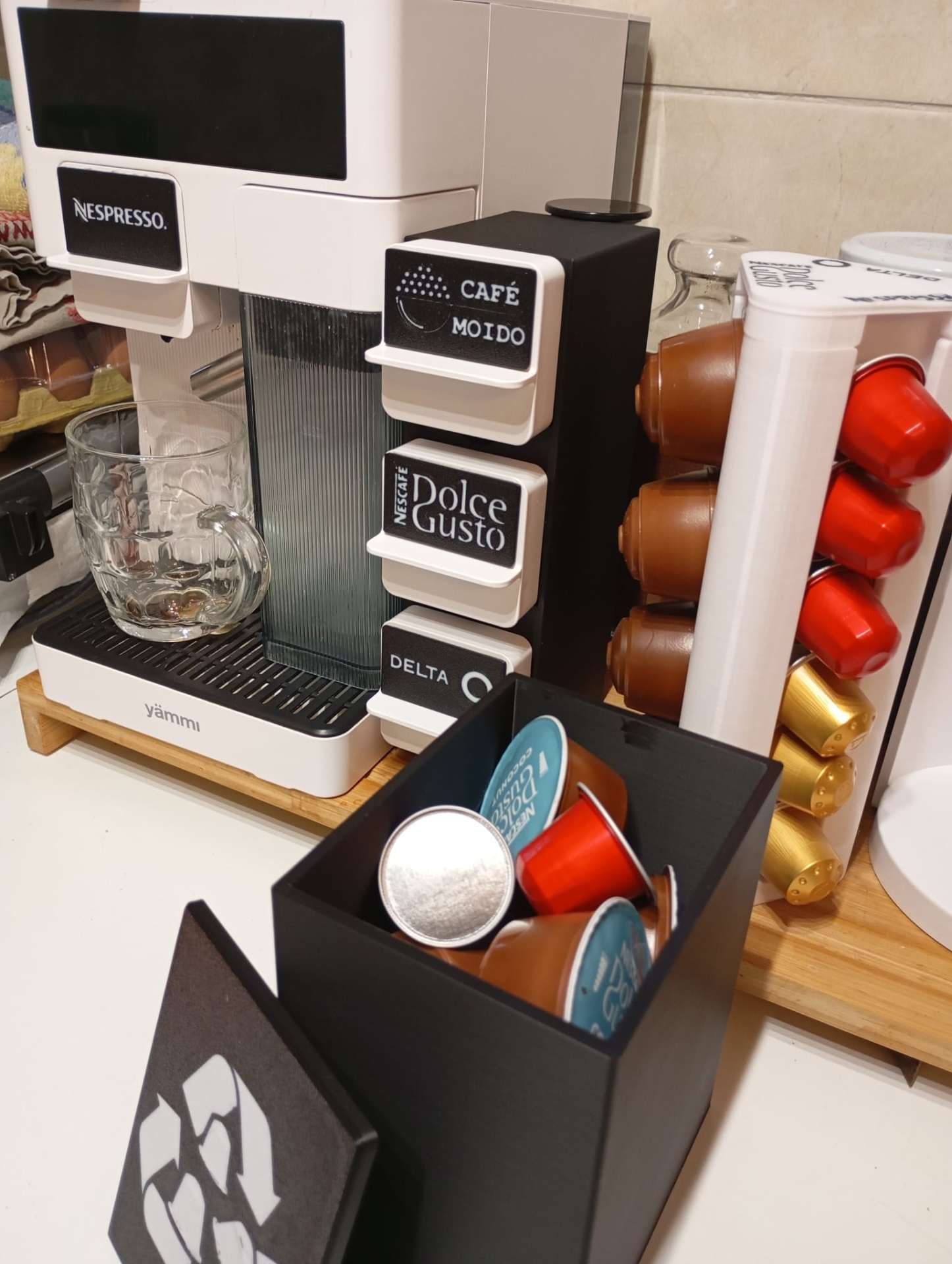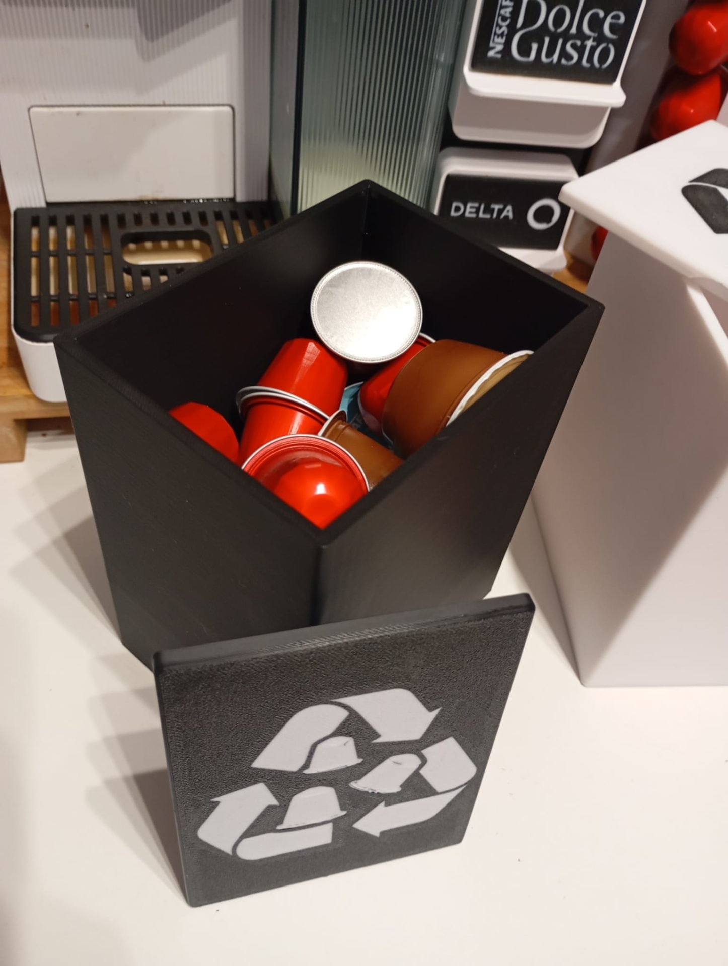 Dê um passo extra na organização e sustentabilidade do seu cantinho de café com este contentor de cápsulas para reciclagem, desenvolvido em impressão 3D. Pensado para receber cápsulas usadas de diferentes sistemas (Nespresso, Dolce Gusto, DeltaQ, etc.), ajuda a manter a bancada limpa enquanto separa as cápsulas para reaproveitamento ou reciclagem posterior.