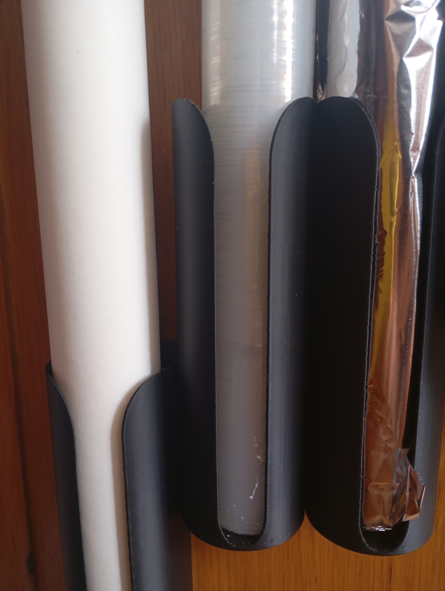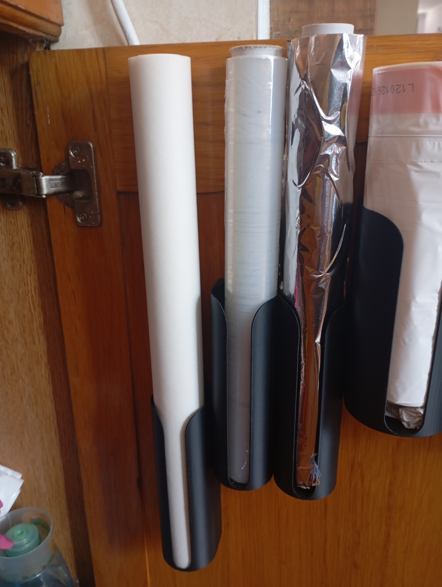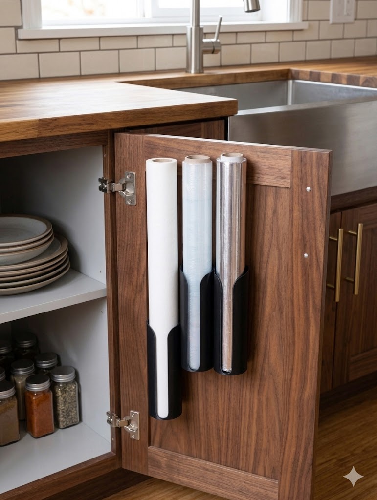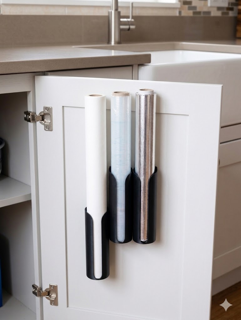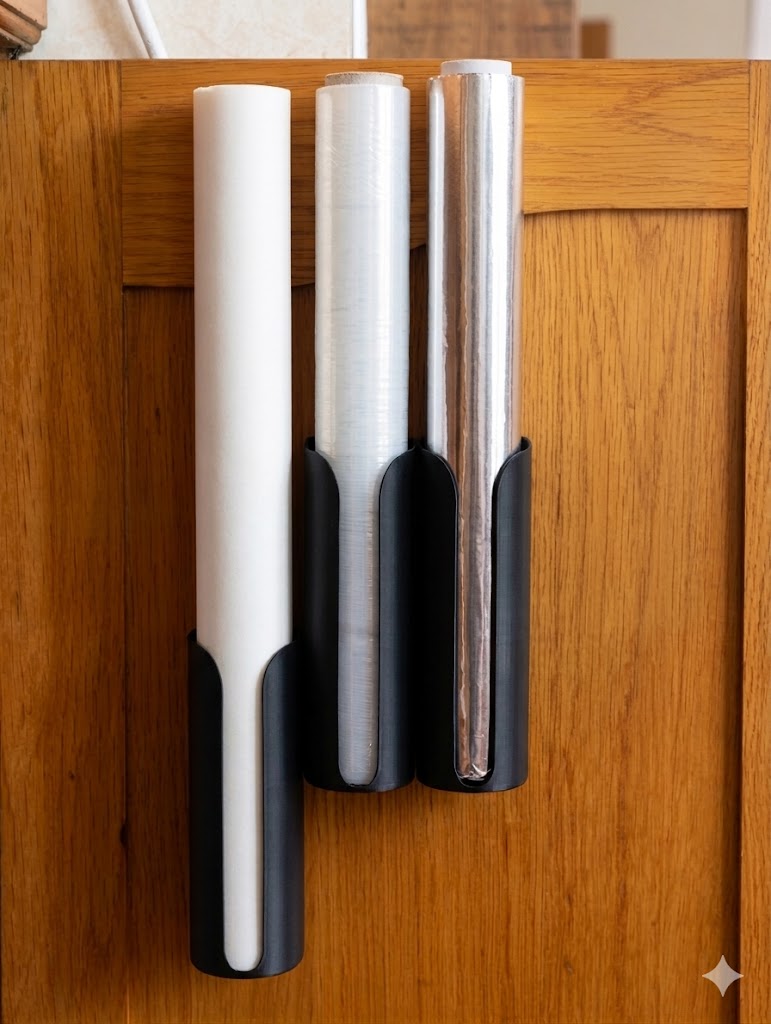 O suporte para rolos de película aderente, papel de alumínio e papel vegetal é a solução perfeita para manter estes essenciais de cozinha organizados e acessíveis. Na foto aparecem 3 unidades, ideais para instalar dentro de portas de armário ou na parede da cozinha, poupando espaço e acabando com a desordem.