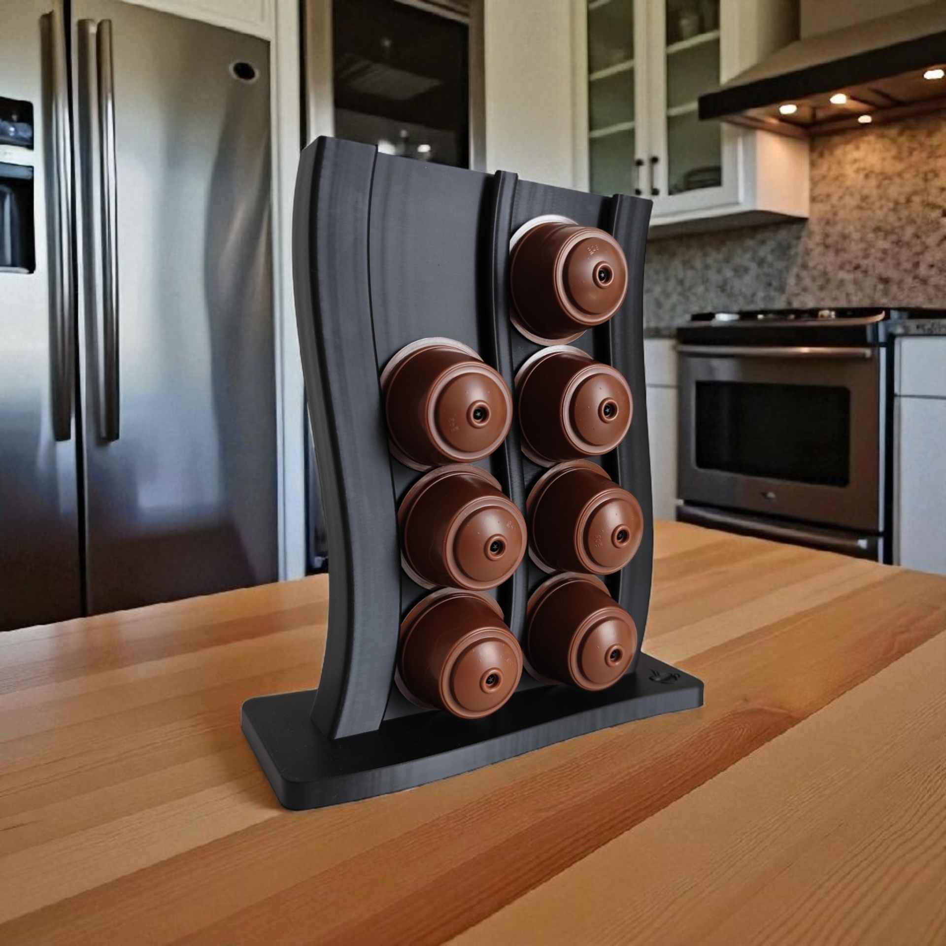 Dá um upgrade ao teu cantinho de café com o Suporte de Cápsulas Wave Rack, um expositor em impressão 3D que organiza as cápsulas em colunas onduladas, criando um efeito visual moderno e dinâmico. Ideal para ter ao lado da máquina ou sobre um aparador, permite ver rapidamente os diferentes sabores, mantendo a bancada arrumada e com estilo.